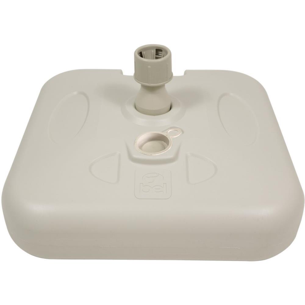 Base para guarda-sol Feita em polietileno Enchimento com agua ou areia Compativel com hastes de 19 mm a 36 mm Dimensoes do produto: 45 cm x 45 cm x 15 cm Antes de usar, encha com 18l de agua ou 22 Kg de areia