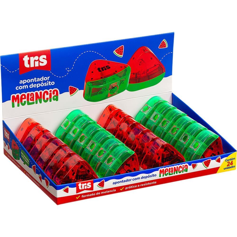 Apontador com deposito em formato de melancia, alegre e pratico. Conta com lamina antiferrugem para maior durabilidade e compartimento para guardar os residuos, ajudando a manter seu espaco sempre limpo.