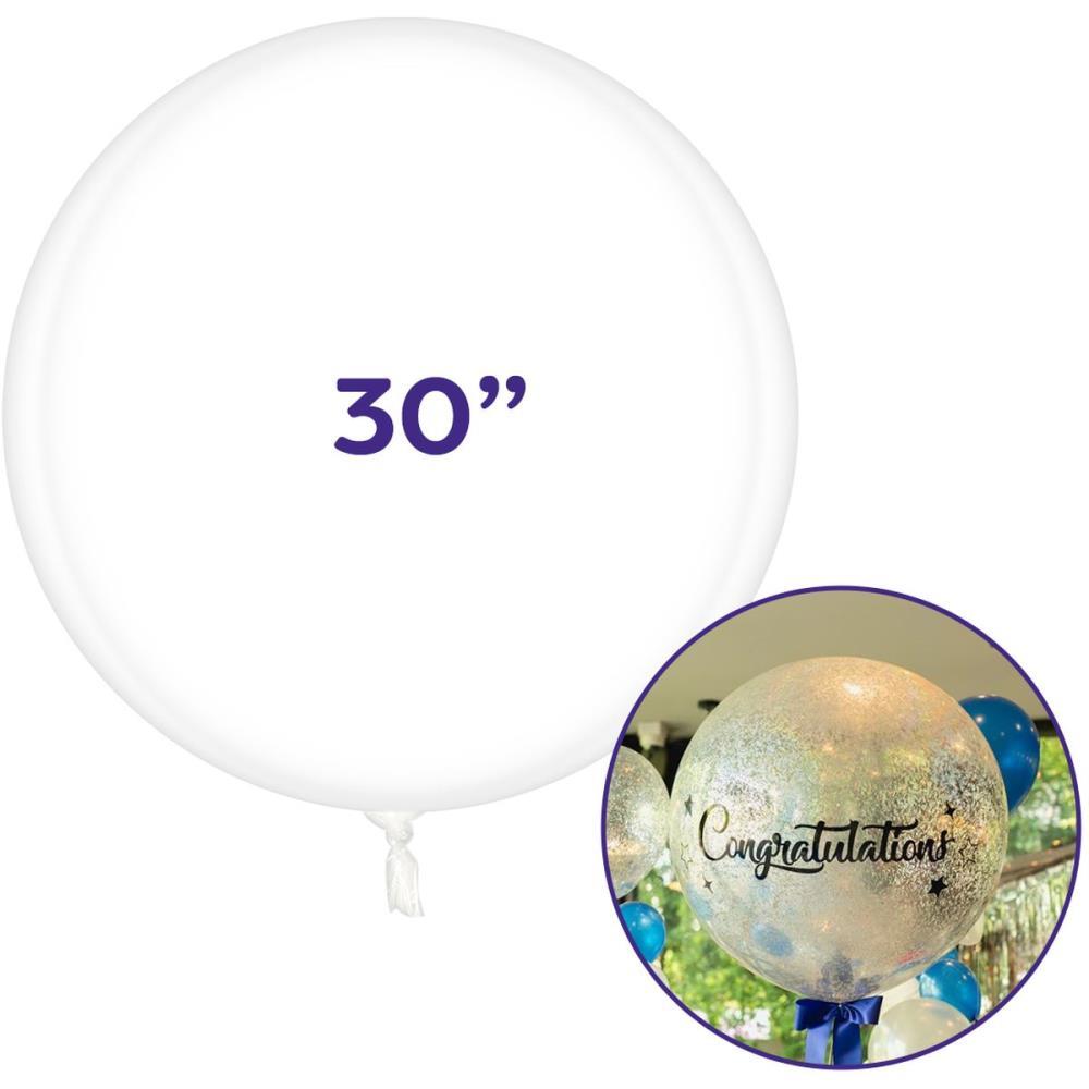 Este balao Bubble de 30" cristalino pode ser personalizado de inumeras maneiras, incluindo canetas especiais, adesivos, Confetes, bolinhas de isopor, penas
