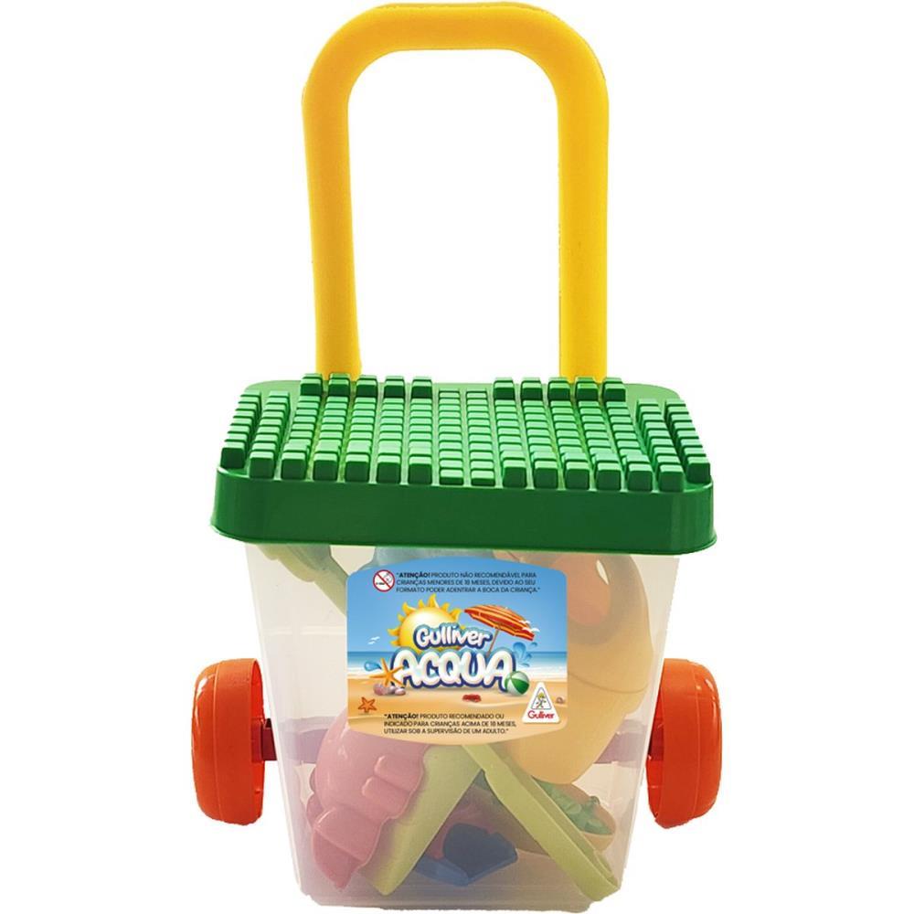 GULLIVER ACQUA BALDE CARRINHO DE PUXAR DE PRAIA COM RODAS LIVRES E COM 8 ITENS, E IDEAL PARA BRINCAR NA PRAIA OU NO JARDIM.