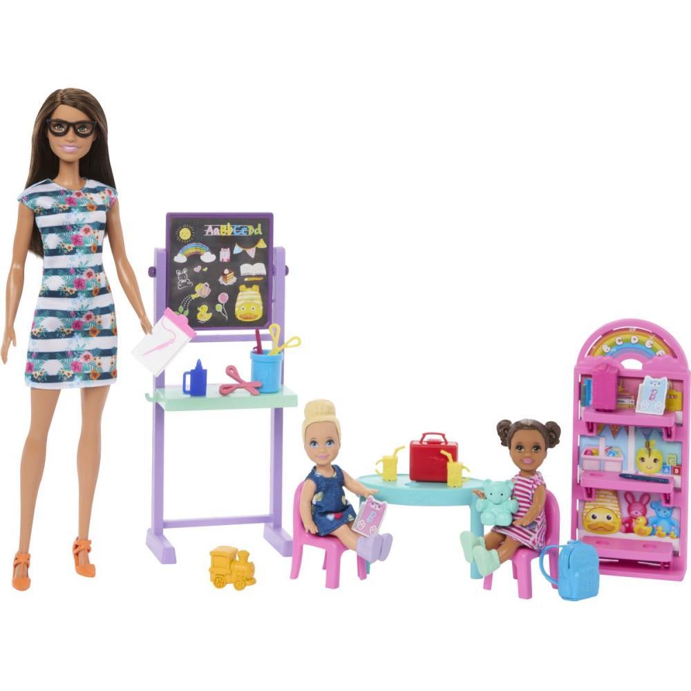 A aula começa com este conjunto pré-escolar da Barbie que vem com a boneca Barbie professora, duas pequenas bonecas infantis e mais de 15 móveis e acessórios de sala de aula. As crianças podem preparar uma área de estar para combinar com qualquer aula com mesa e cadeiras, um espaço de arte com cavalete e uma estante para guardar itens menores. Com peças como mochila, lancheira, cadernos, materiais de arte e muito mais, as crianças podem mergulhar na diversão da dramatização!