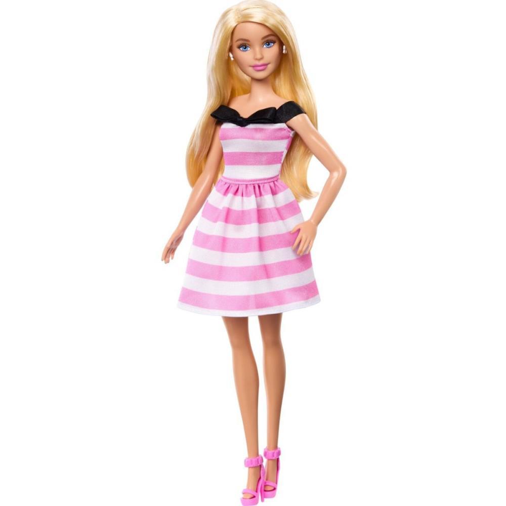 O aniversário de 65 anos da Barbie pode ser celebrado com esta boneca comemorativa da Barbie! Ela arrasa em um vestido listrado rosa e branco com um laço preto na linha do decote, para destaque extra. Brincos de pérolas e sandálias rosa de salto completam seu visual clássico! Esta boneca é um presente perfeito para as crianças e para os fãs da Barbie de todas as idades. A boneca não fica em pé sozinha. As cores e as decorações podem variar.