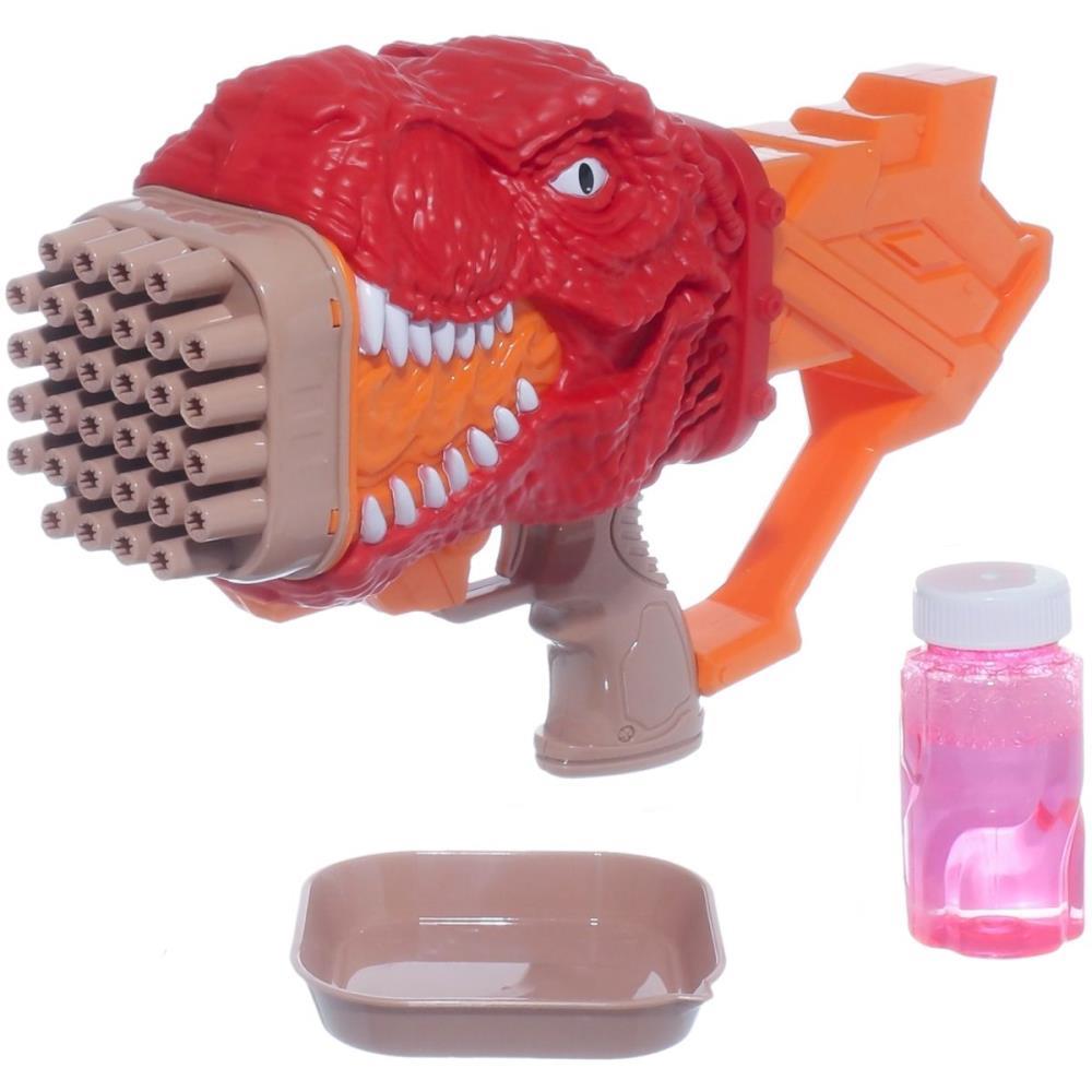 Pistola lanca bolhas em formato de dinossauro. Faz muitas bolhas. funciona com 4 pilhas AA pilhas nao inclusas . Acompanha refil e bandeja .