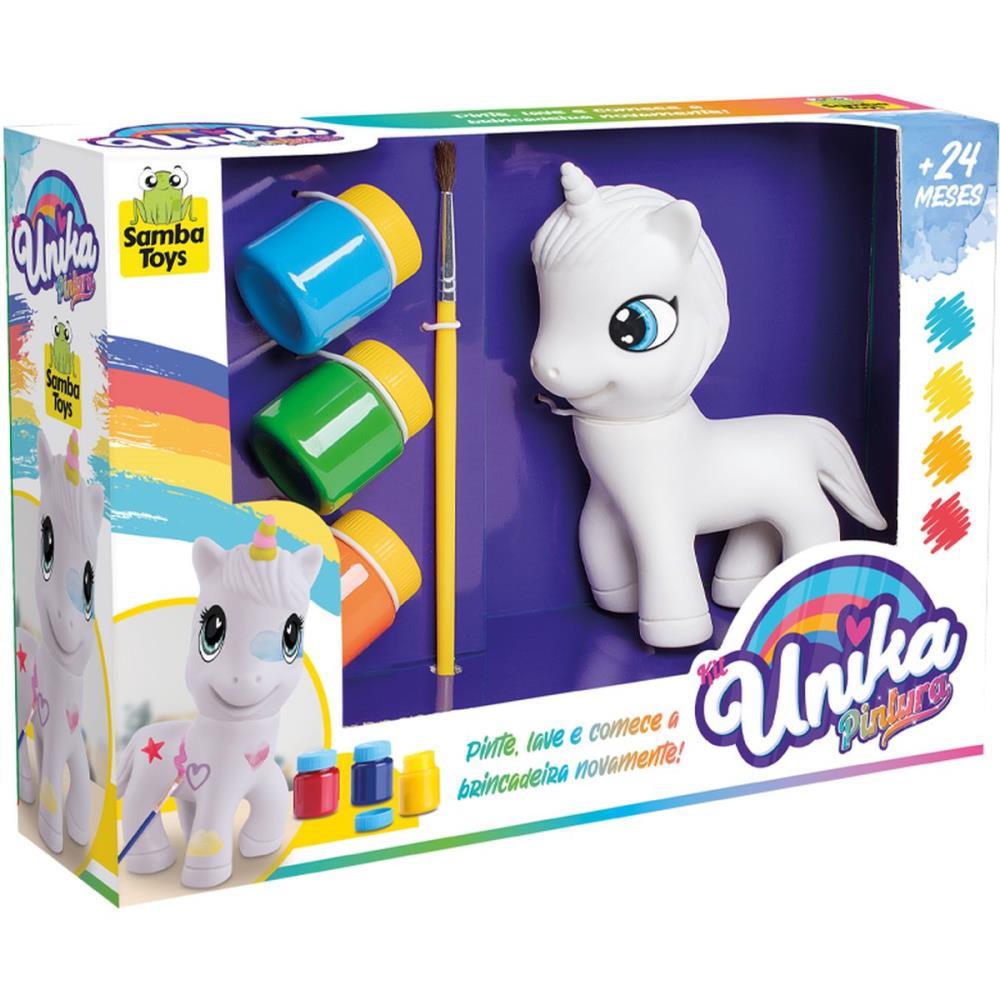 Contém: 1 Boneco unicórnio, 4 tintas guache, 1 pincel.