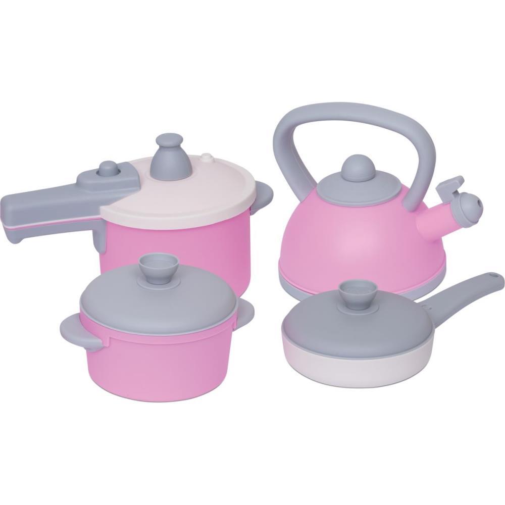 Conjunto completo com 4 pecas, incluindo: panela de pressao, chaleira, panela com tampa, frigideira, Design moderno com cores suaves Rosa, branco e cinza.