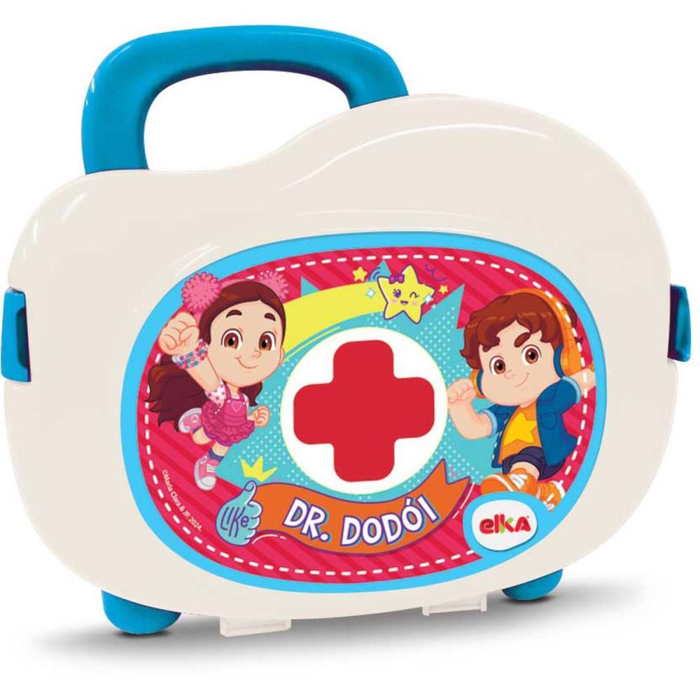 Dr. Dodoi e um kit de maletinha. que vem com termometro para medir a temperatura, otoscopio para examinar os ouvidos, estetoscopio para ouvir o coracao e os pulmoes, curativo para cuidar daquele machucado e ate gesso para engessar um braco quebrado! Tudo isso guardados em uma maleta pratica que ajuda a crianca a levar a brincadeira para onde quiser!