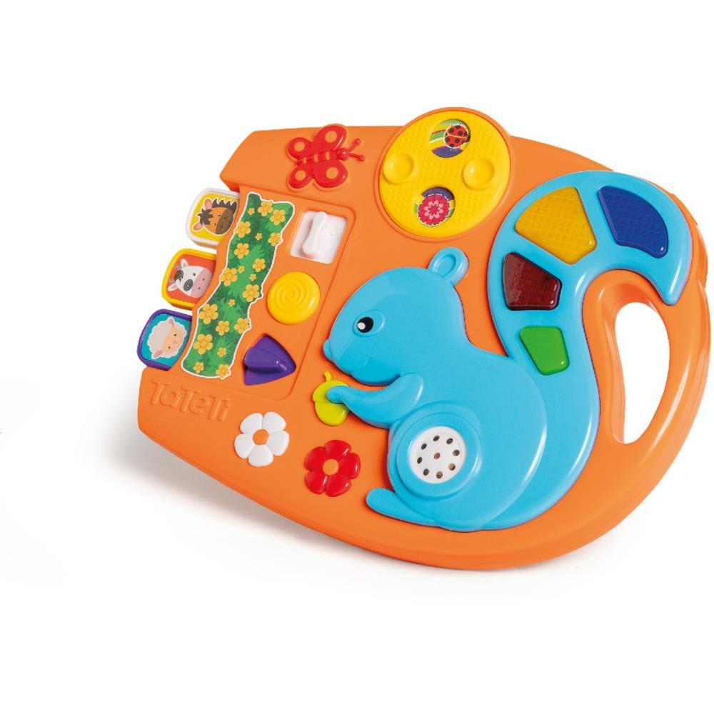 5 melodias diferentes, teclas com cores e luzes, elementos de acao surpresa gira, desloca e aperta, adesivos e elementos tampografados