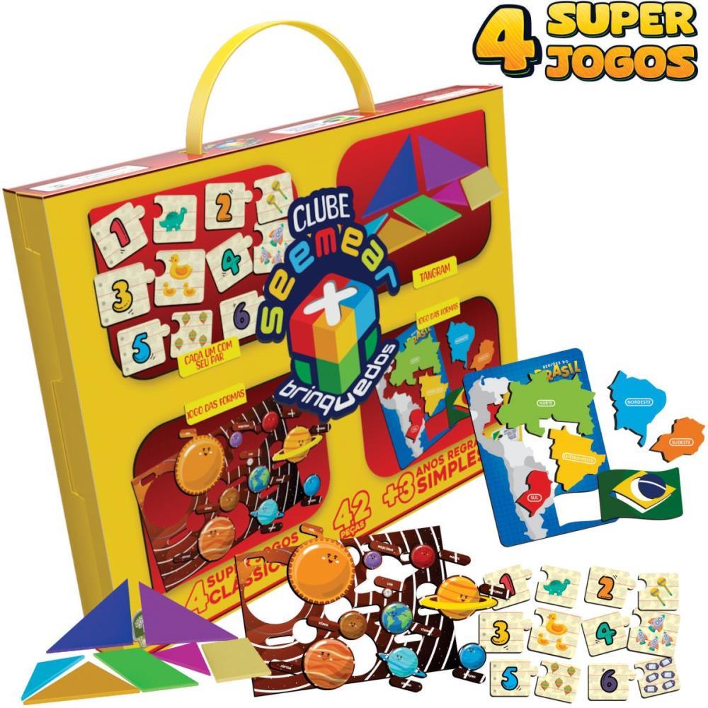CLUBE SEEMEAR 45 reune quatro jogos desafiadores para os pequenos se divertirem aprendendo e interagindo com suas familias e amigos. Esta versao conta com o TANGRAM, associacao de NUMEROS QUANTIDADES, JOGO DAS FORMAS SISTEMA SOLAR e MAPA DO BRASIL REGIOES. E brincadeira onde aprender e desenvolver sao exercitados de maneira ludica e alegre. Aprovado pelo INMETRO e concebido em madeira de reflorestamento certificada, impressao OFFSET e corte LASER.