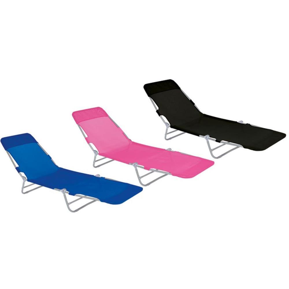 Reclinavel em ate 5 posicoes Suporta ate 100kg Tela em textilene Com protecao UV e anti-mofo Produzida em aco Facil de guardar, dobravel Pratica de carregar Com regulagem e trava de posicoes Sapatas de protecao Disponivel nas cores: azul-marinho, preto e rosa