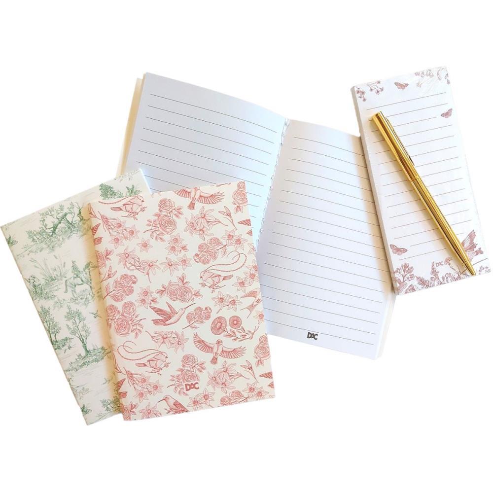 O conjunto de papelaria DAC e o presente perfeito para quem nao abre mao de uma organizacao elegante. Ele companha 3 cadernos de 32 folhas cada, 1 bloco de anotacoes com 60 folhas e 1 caneta azul com acabamento dourado.