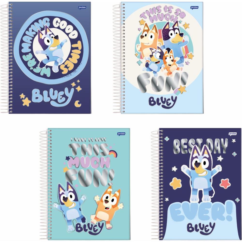 Historias leves, imaginacao e valores afetivos. Bluey conquista com humor e carinho familiar. Com capas duras ilustradas com os personagens mais queridos da serie, cada modelo transmite alegria, aventura e muito carinho. O acabamento com laminacao fosca e detalhes em Hot Stamping da um toque moderno e encantador as artes. Alem do visual cativante, o caderno conta com Pauta Inteligente JandaIA, que facilita a organizacao das anotacoes, e diversos acessorios funcionais: cartela de adesivos personalizados, guarda decorado, divisorias ilustradas e folhas de planejamento.