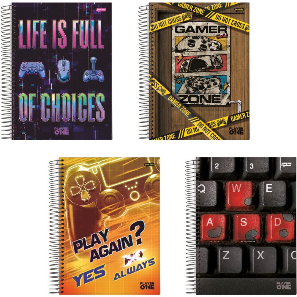 Caderno 15x1 Capa Dura Player 240 fls. - Jandaia, Caderno para os fans de Gamers, capa com aplicacao de laminacao fosca e verniz reserva com bolso em papel, cartela de adesivos e miolo decorado.