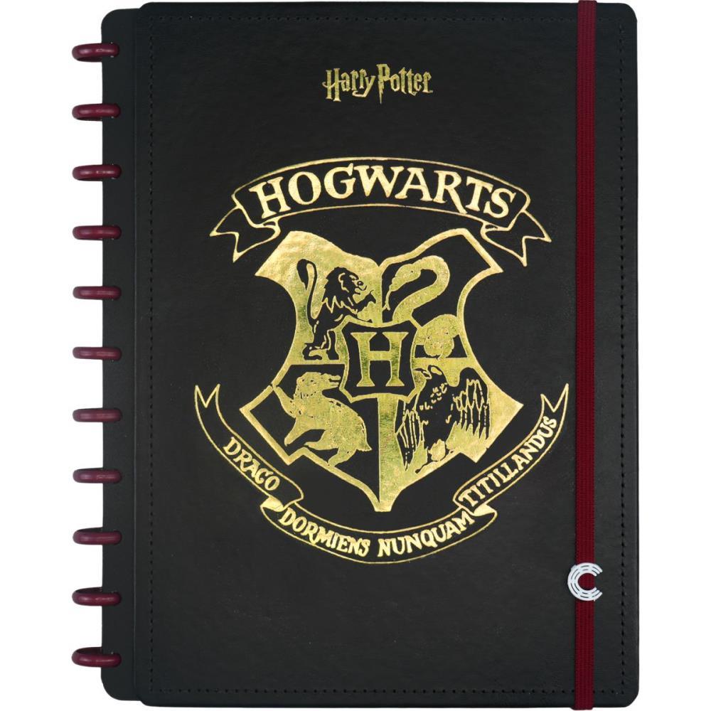 Com acabamento premium em hotstamping dourado, folhas off-white personalizadas, adesivos tematicos e divisorias nas cores das casas Grifinoria, Sonserina, Corvinal e Lufa-Lufa.