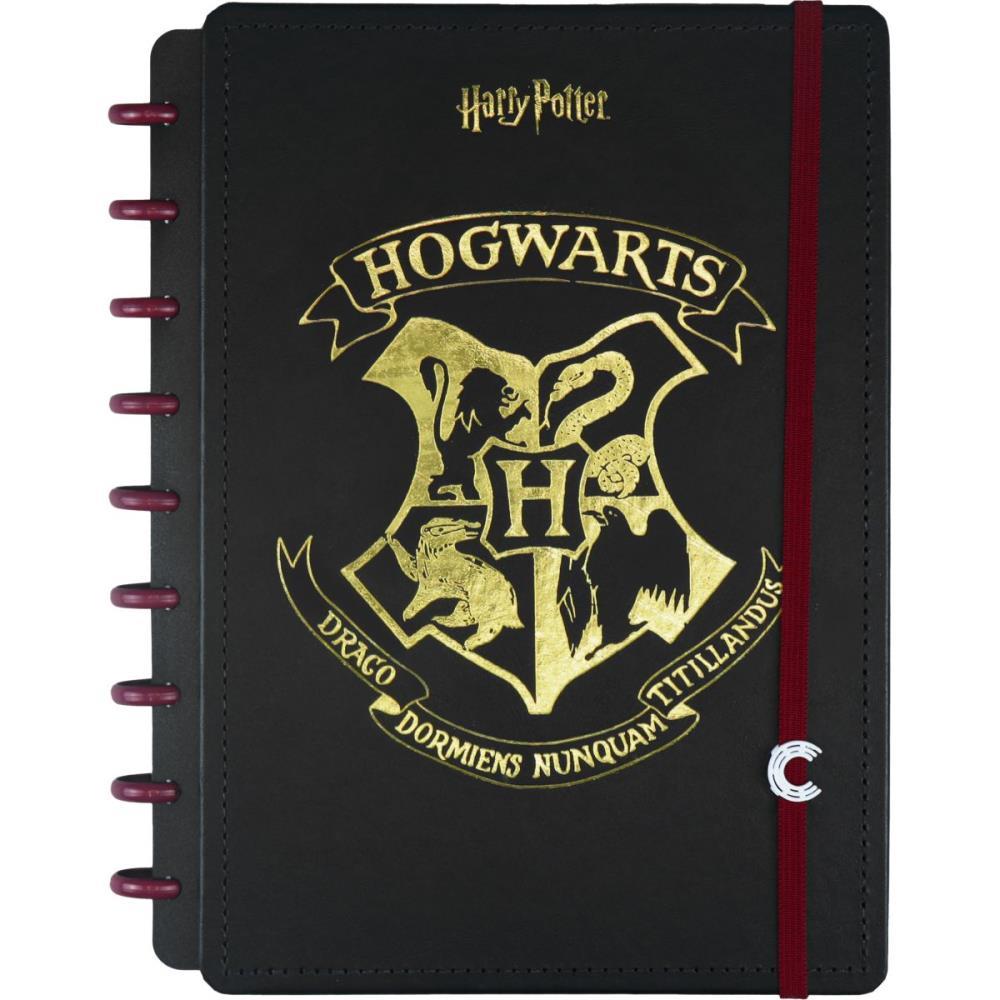 Com acabamento premium em hotstamping dourado, folhas off-white personalizadas, adesivos tematicos e divisorias nas cores das casas Grifinoria, Sonserina, Corvinal e Lufa-Lufa.