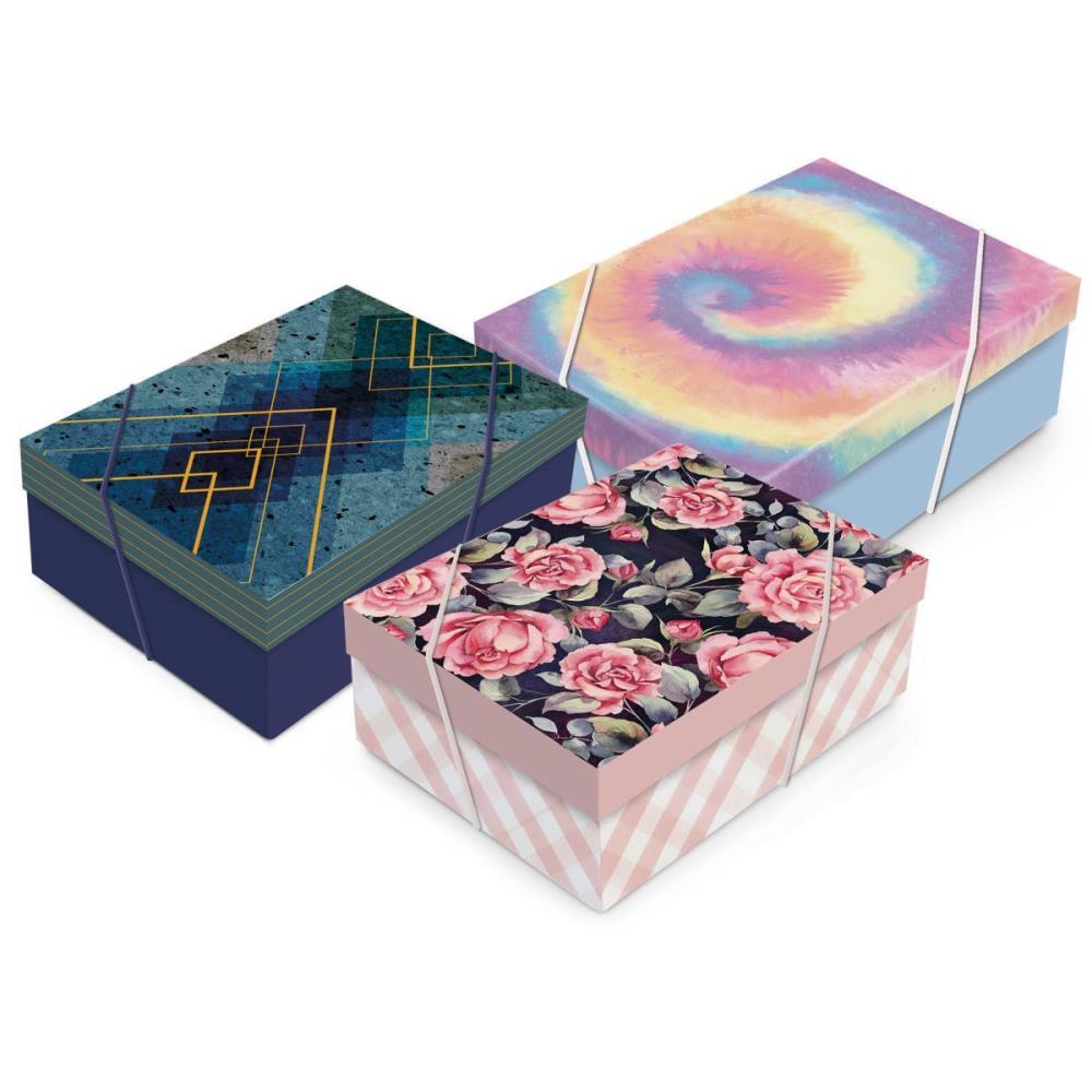 Caixa pequena retangular com elástico, tampa e estampa. Sortidas. Tamanho: 24 x18 x 8 cm.