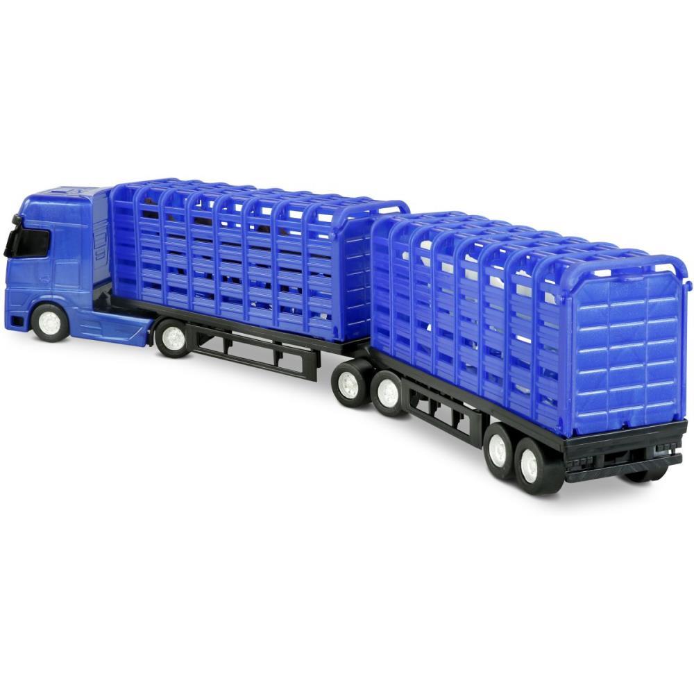 Caminhao com carreta dupla, destinada ao transporte de animais. Possui rodas livres, cabine e carretas independentes entre si, possibilitando a articulacao durante as manobras, bem como portas nas carretas para entrada e saida dos animais. Produzidos em plastico resistente, brilhante e em diversas cores. Pratico para brincar em qualquer superficie e em qualquer ambiente.