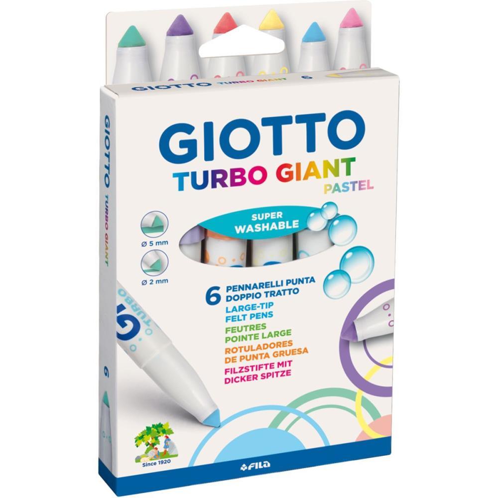A canetas Giotto Turbo Giant possuem ponta conica que permite dois tipos de tracos: fino e largo disponivel em 06 cores de tonalidades pasteis e 06 cores de tonalidades fluo. Tampa anti-asfixia, ponta de 7,5 mm