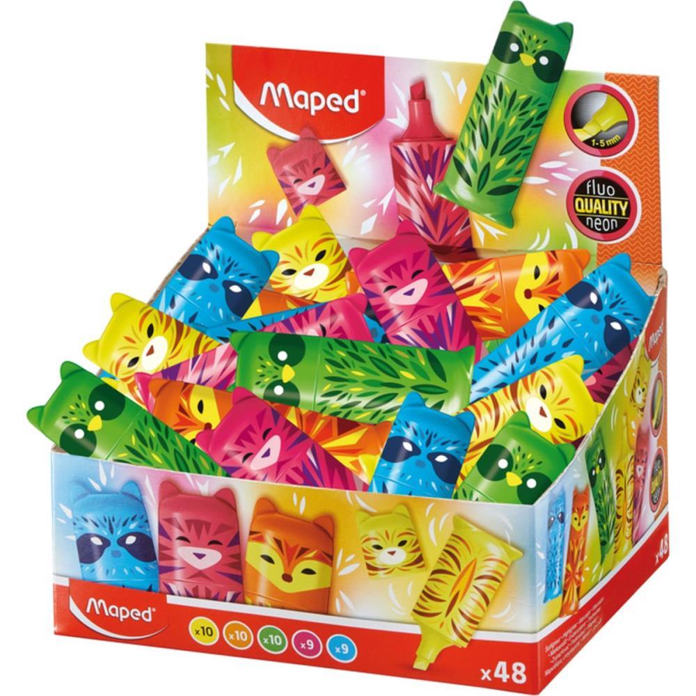 Voce vai adorar os marcadores de Mini Friends com seu design kawaii na forma de animais fofos. Praticos, divertidos e bonitos, sao unanimes. Seu mini formato e funcional. Eles cabem em qualquer lugar, no bolso, no estojo ou na mesa. Eles ficam de pe. Jogue e organize-os como quiser. Os 4 marcadores de Mini Friends sao lindos e coloridos. As tampas sao intercambiaveis, o suficiente para criar historias e personagens engracados. Seu pequeno tamanho de 7 cm tambem permite que criancas pequenas os usem facilmente. A tinta fluorescente e perfeita: Tintas fluorescentes luminosas de qualidade Maped, que nao penetram nem rasgam o papel. A tinta fluorescente e resistente a fotocopias e tambem a faxes. Pode ser deixado aberto por 4 horas sem secar.