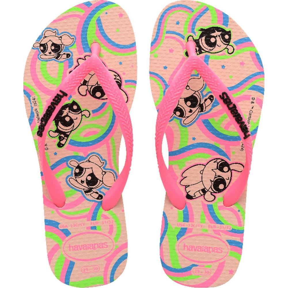 Lindinha, Florzinha e Docinho estao prontissimas para salvar o dia no chinelo Kids Slim Powerpuff Girls. Com modelo slim, ou seja, com tiras e solado mais finos, essa sandalia e ultraconfortavel e esta disponivel em duas estampas incriveis das Meninas Superpoderosas. A cartela de cores traz um mix de neons, que promete agradar em cheio as pequenas heroinas mundo afora! Alem disso, as tiras contam com logo Havaianas em destaque e contraste.