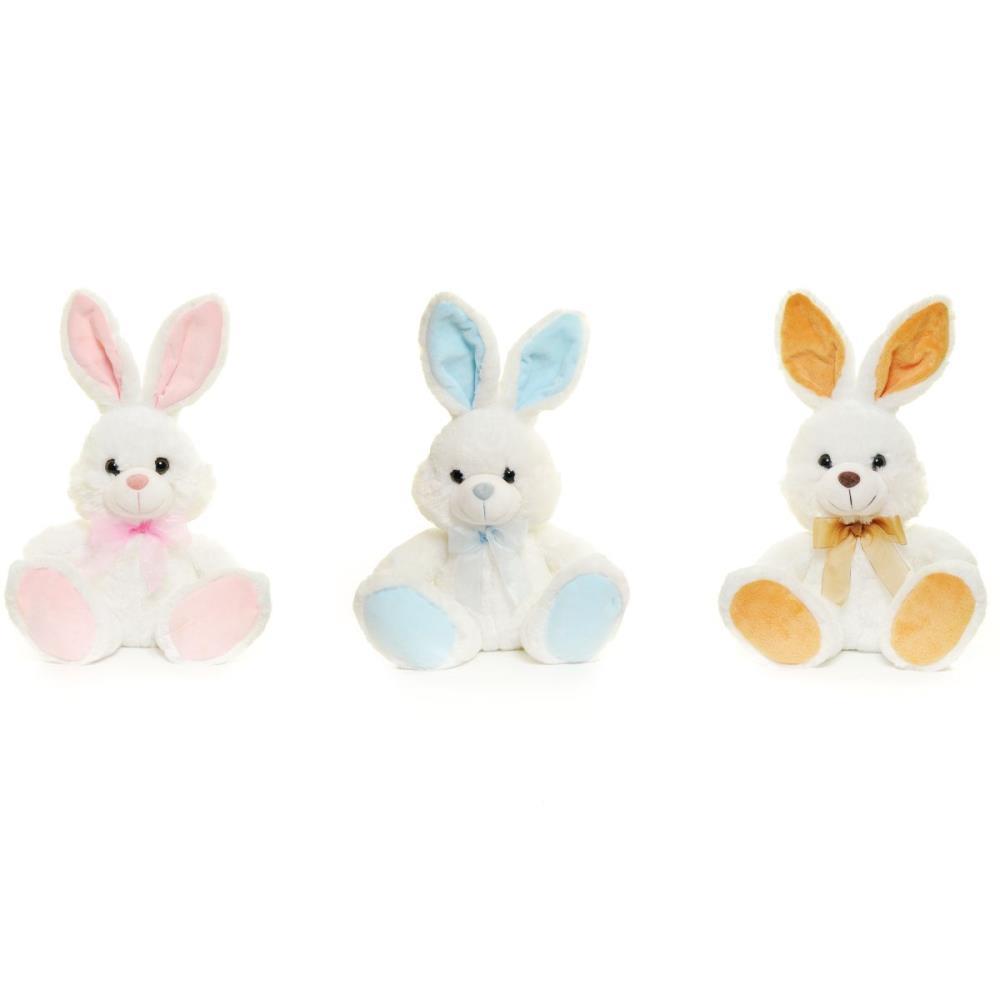 Coelho pequeno de pelucia sortido com enchimento de manta acrilica nas cores rosa, branco, azul e bege - 100% Poliester - tam.P 25x13x16 - essencial para decoracoes em ambientes de pascoa, montagem de cestas, presentear, etc