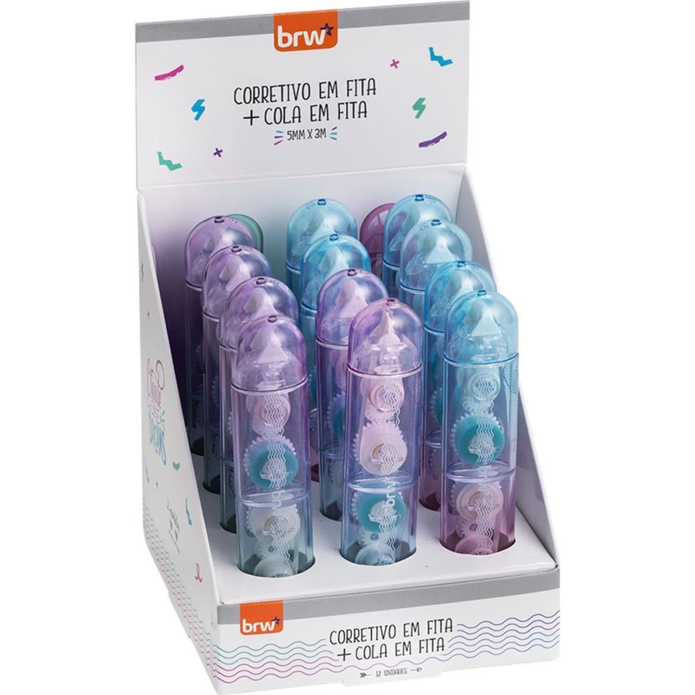 ESSE PRODUTO INOVADOR DA BRW E 2 EM 1: UM LADO COLA EM FITA E O OUTRO CORRETIVO EM FITA. FITA DE 5MM X 3M, CORPO COLORIDO E SORTIDO EM DUAS CORES