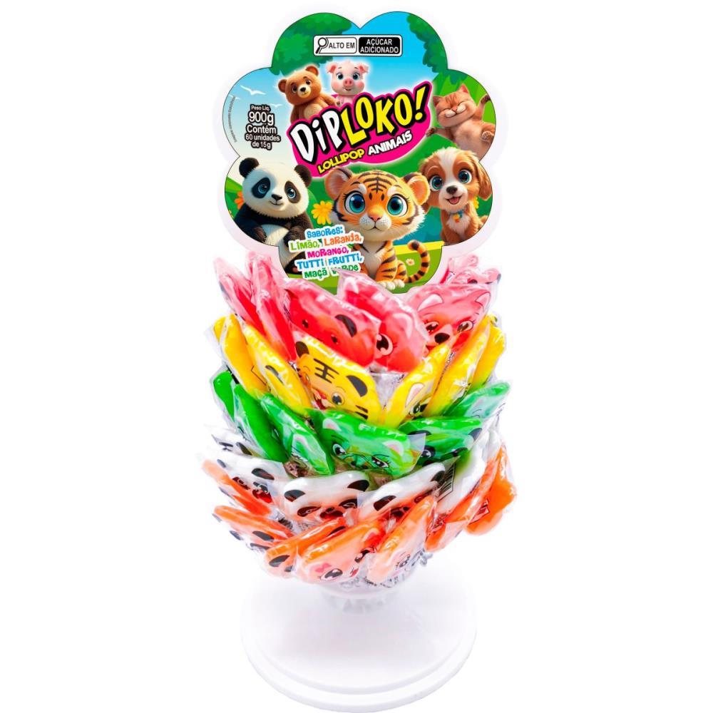 Dip Loko Lollipop Animais sabores limao, laranja, morango, tutti frutti e maca verde.