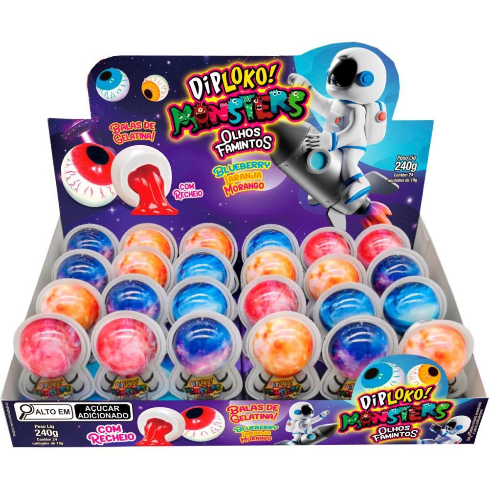 Balas de gelatina recheadas sabores: morango, laranja e blueberry.