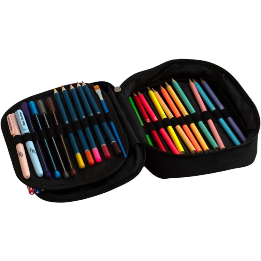 Estojo estilo marmitao preto, com compartimento para canetas e lapis.