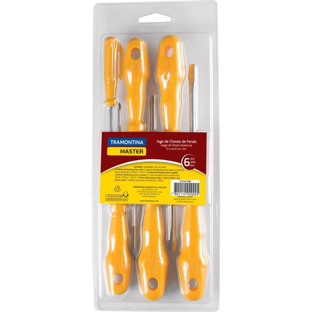 Um jogo que traz chaves de fenda com ponta chata, ponta cruzada e ainda uma chave clipe, ideal para fixar em cintos e alcas e que e um coringa na hora de apertar ou afrouxar parafusos. Todas as pecas sao muito resistentes: tem hastes produzidas em aco especial cromado e cabos em polipropileno injetado. Alem disso, sao altamente duraveis e vao levar muito mais praticidade na execucao de suas tarefas.