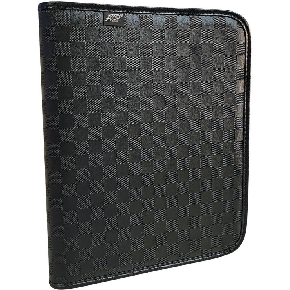 Fichario com capa de couro sintetico e estampa quadriculada. Dentro vem com bloco de 96 folhas e 6 divisorias transparentes.