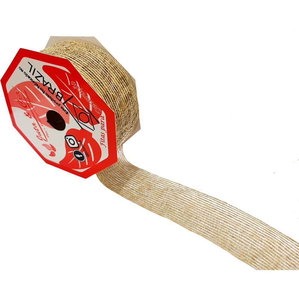 As linha de fitas de Jute da Juta & Cia, sao feitas de fios de polipropileno, material similar a juta, porem sintetico. Caracteristicas deste produto: Cor Natural, sem avesso. Medidas: Rolo de 10 metros e largura de 38mm. Possui um fino arame para dar forma.