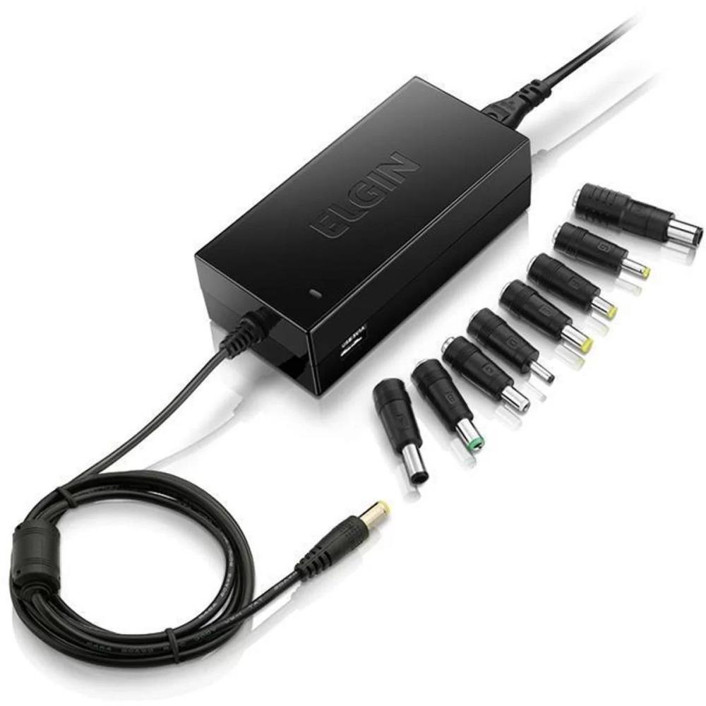 Fonte para notebook de 90W com compatibilidade com as principais marcas de notebooks do mercado. 8 conectores moveis e 1 fixo. Carregam dispositivos USB. Protecao contra curto-circuito. Peso: 280g. Bivolt automatico.