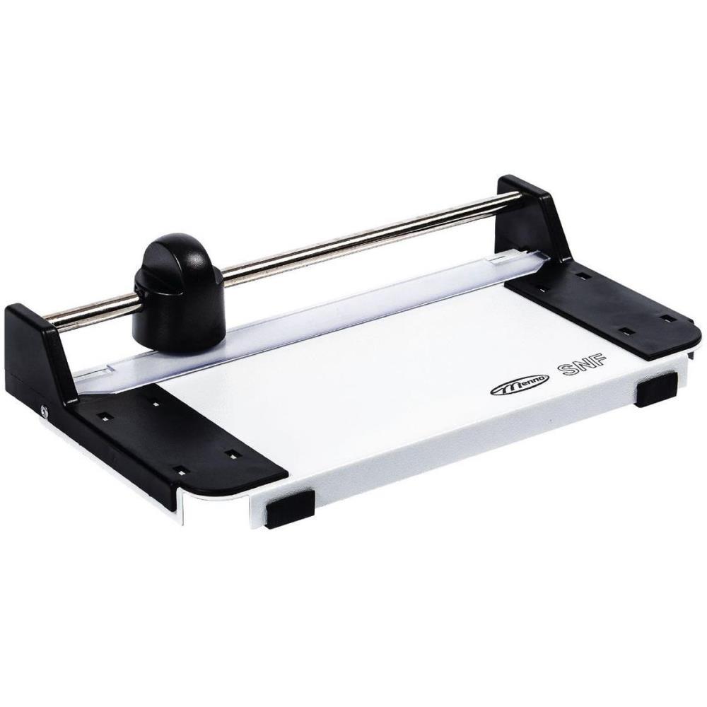 Tampo em aco pintado eletrostaticamente, com serigrafia com escala milimetrica e dimensoes usuais de corte. Possui regua de seguranca e prensadora de papel. Na base possui apoio de borracha para maior aderencia.