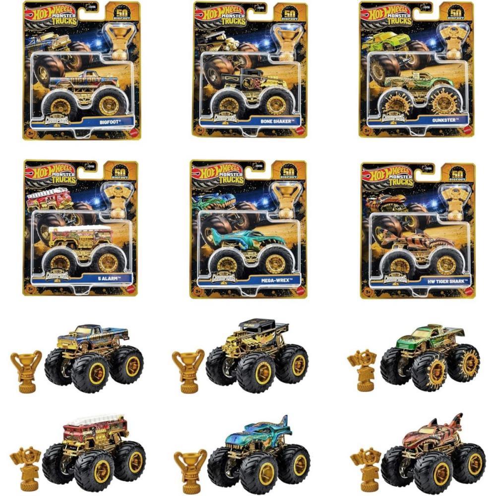 Entrando na celebracao do 50º aniversario do Bigfoot com um caminhao de brinquedo comemorativo especial! Cada veiculo Die-cast em escala 1:64 apresenta um personagem favorito dos fas do Monster Trucks com caracteristicas premium, como decoracao e detalhes dourados. Inclui um acessorio de trofeu do campeonato Hot Wheels Monster Trucks Live. Com 10 Caminhoes favoritos dos fas para escolher e tres trofeus possiveis, colecionadores e criancas de 3 a 6 anos vao querer todos eles. Cada um e vendido separadamente. As cores, os estilos e as decoracoes podem variar.