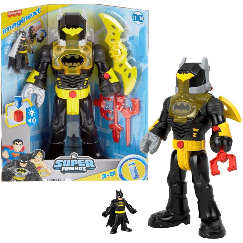 As crianças em idade pré-escolar podem levar suas aventuras de DC Super-Herói para o próximo nível com este conjunto de robô Imaginext DC Super Friends Batman Traje Insider & Exo da Fisher-Price. Com os vilões à solta, Batman tira seu maior dispositivo: o Exo Suit. As crianças podem colocar a figura posável dentro da cabine do piloto do robô e enviar a poderosa dupla para o resgate! Com luzes e sons incríveis, além de 4 acessórios de batalha, este conjunto de figuras de robô está repleto de oportunidades para brincadeiras imaginativas.