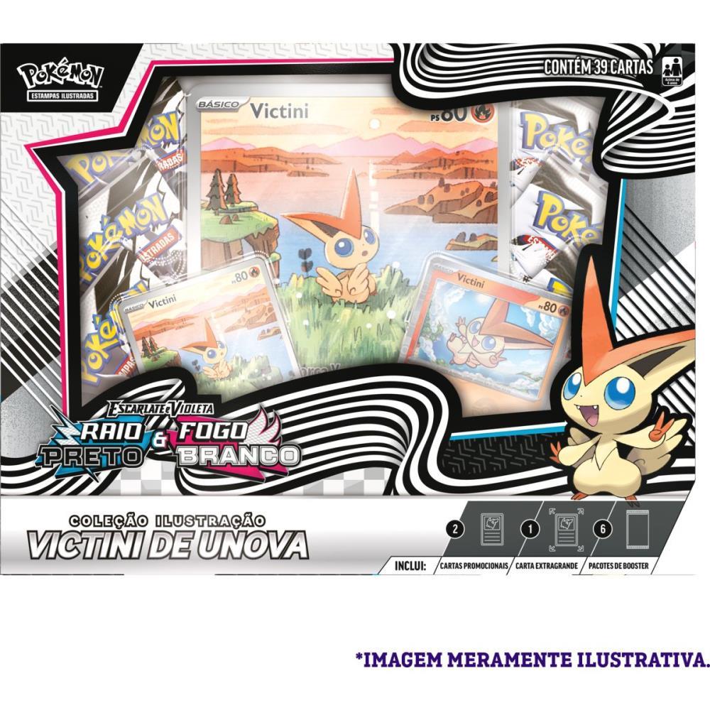 Dizem que o Pokemon Mitico Victini cria uma energia infinita que pode compartilhada com seus amigos, e agora voce pode se unir a ele nos seus ser baralhos do Pokemon Estampas Ilustradas! Nesta colecao, voce vai receber uma promocional com ilustracao rara, uma carta holografica paralela carta holografica premium de Victini e uma carta extragrande. Voce tambem vai encontrar ainda mais Pokemon da regiao de Unova nos pacotes de booster das expansoes! Escarlate e Violeta - Raio Preto e Escarlate e Violeta - Fogo Branco!"