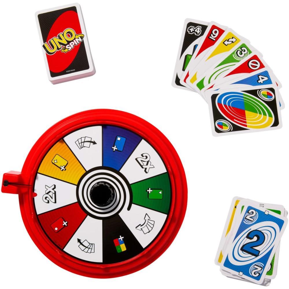 O UNO Spin traz um giro inesperado ao clássico jogo de cartas que todos adoram! Os jogadores se revezam com suas cartas, combinando cor, número ou ação, com o objetivo de se livrar de todas elas. Quando uma carta de giro é lançada, o jogador deve girar a roleta e seguir a ação indicada. Com diferentes poderes como Comprar por Cor, Trocar de Mão, Descartar por Cor e Giro Duplo, tudo pode mudar de uma hora para outra — especialmente se alguém esquecer de gritar “UNO!”. O jogo vem com 112 cartas e 1 roleta. Cores e decorações podem variar.
