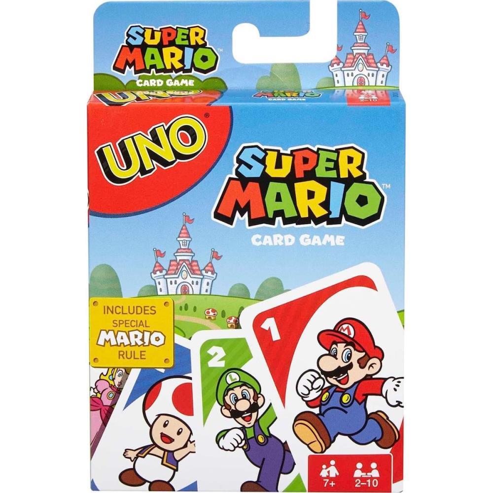 Junte-se a Mario, Luigi e todos os seus amigos para um jogo especial de UNO! É o clássico UNO que você adora, mas esta versão também inclui um Mario Super Star Card especial que torna seu personagem invencível! Depois que outro jogador joga uma carta Draw 2+ ou Wild Draw 4+, você joga a Super Star Card para devolver o poder a esse jogador e fazê-lo comprar duas ou quatro cartas! Ganhe pontos sendo o primeiro a se livrar de todas as cartas da sua mão. Primeiro jogador ou equipe a 500 vitórias. Quando você estiver com apenas uma carta, não se esqueça de gritar UNO! Contém 112 cartões e instruções simples. Para 2 a 10 jogadores, com 7 anos ou mais. Cores e decorações podem variar.