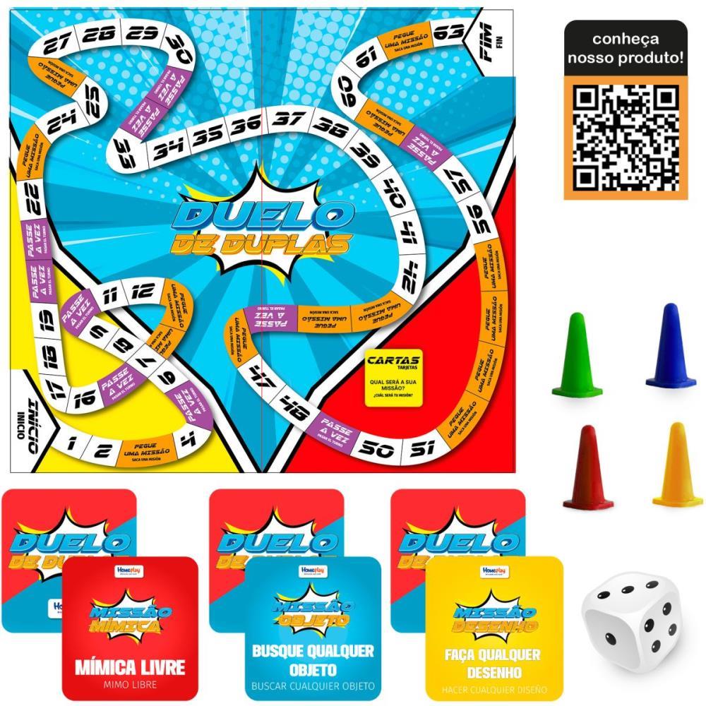 Desafie suas habilidades com o Duelo de Duplas! Este emocionante jogo de tabuleiro inclui 30 cartas, 4 pinos, 1 dado e um tabuleiro de 38x30 cm, perfeito para ate 4 jogadores.