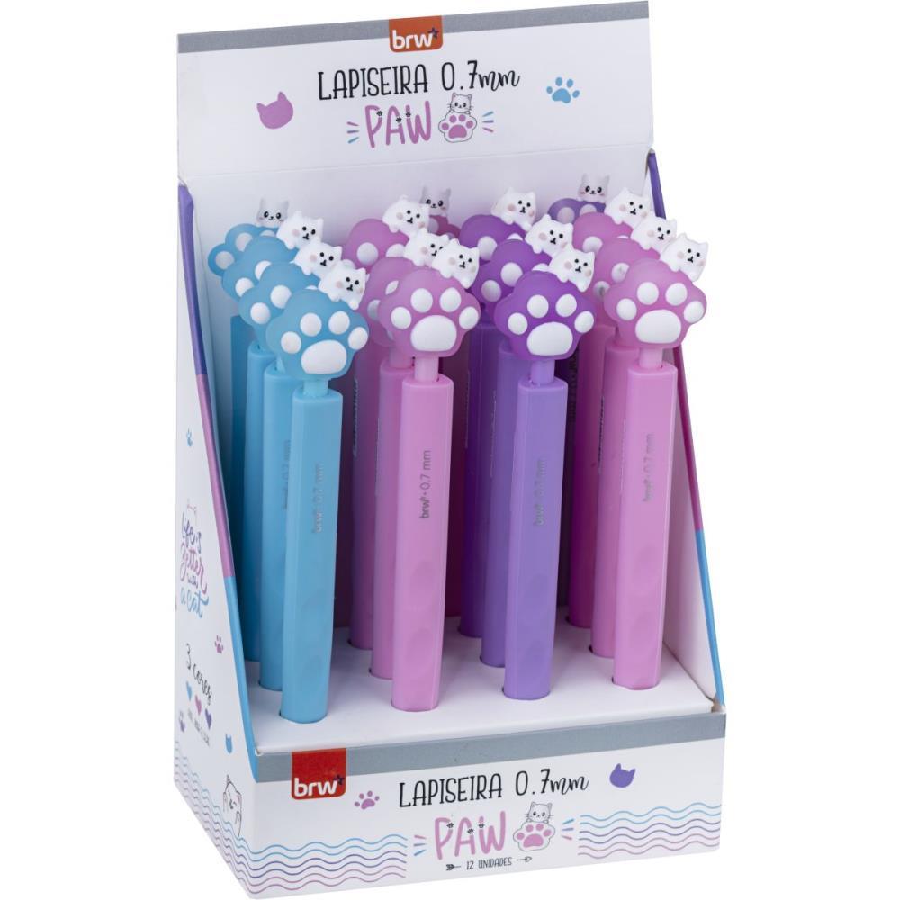 LAPISEIRA PAW 0,7MM PLASTICA, DISPLAY COM 12 UNIDADES, PONTEIRA COM PATA PET E ROSTO GATO AO FUNDO, CORPO TRIANGULAR E PEGA GRIP ADERENTE