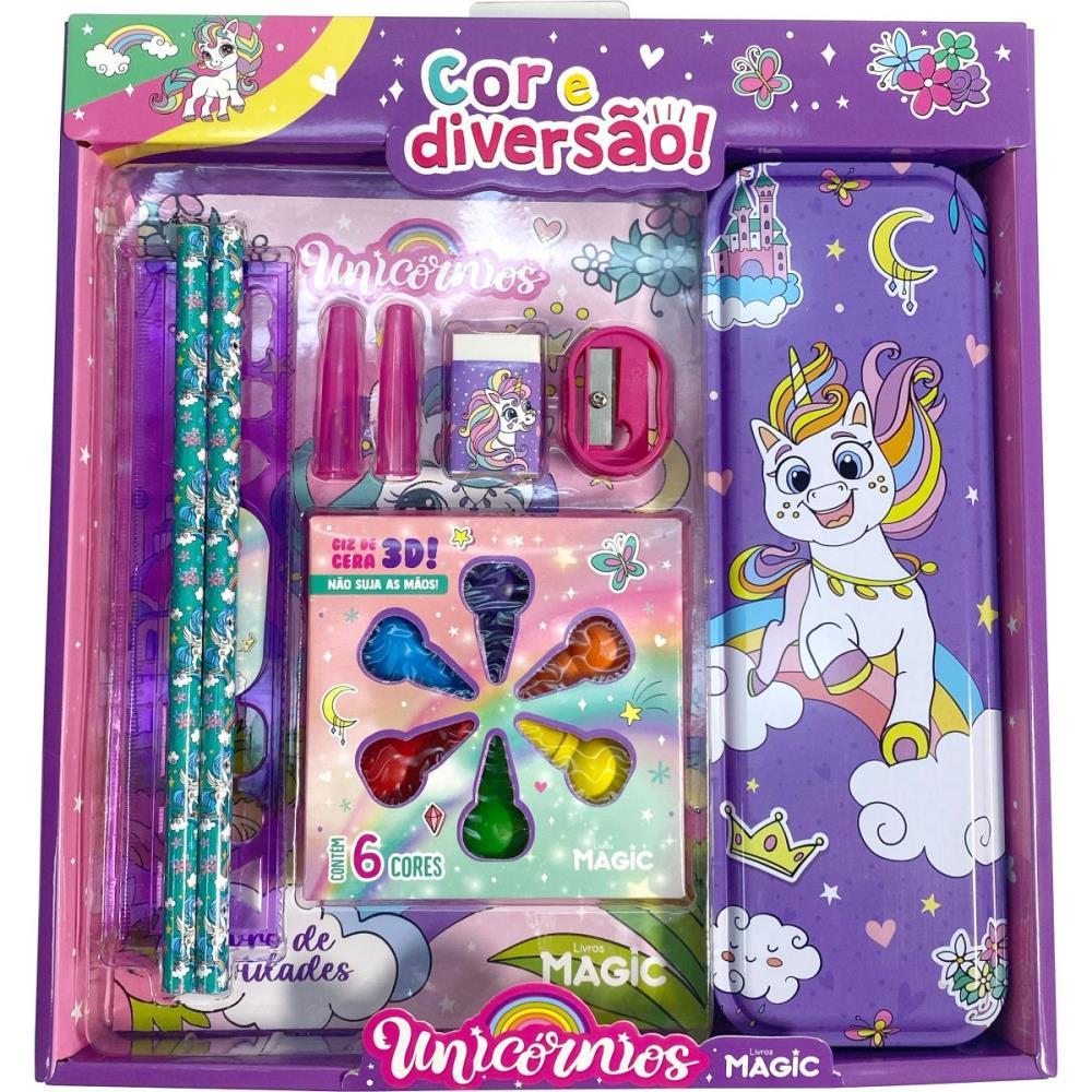 Contem: 1 estojo metalico, 1 kit de giz de cera 3D, 1 regua, 2 lapis grafite com tampa, 1 apontador, 1 borracha 1 livro de atividades, 1 jogo da memoria.