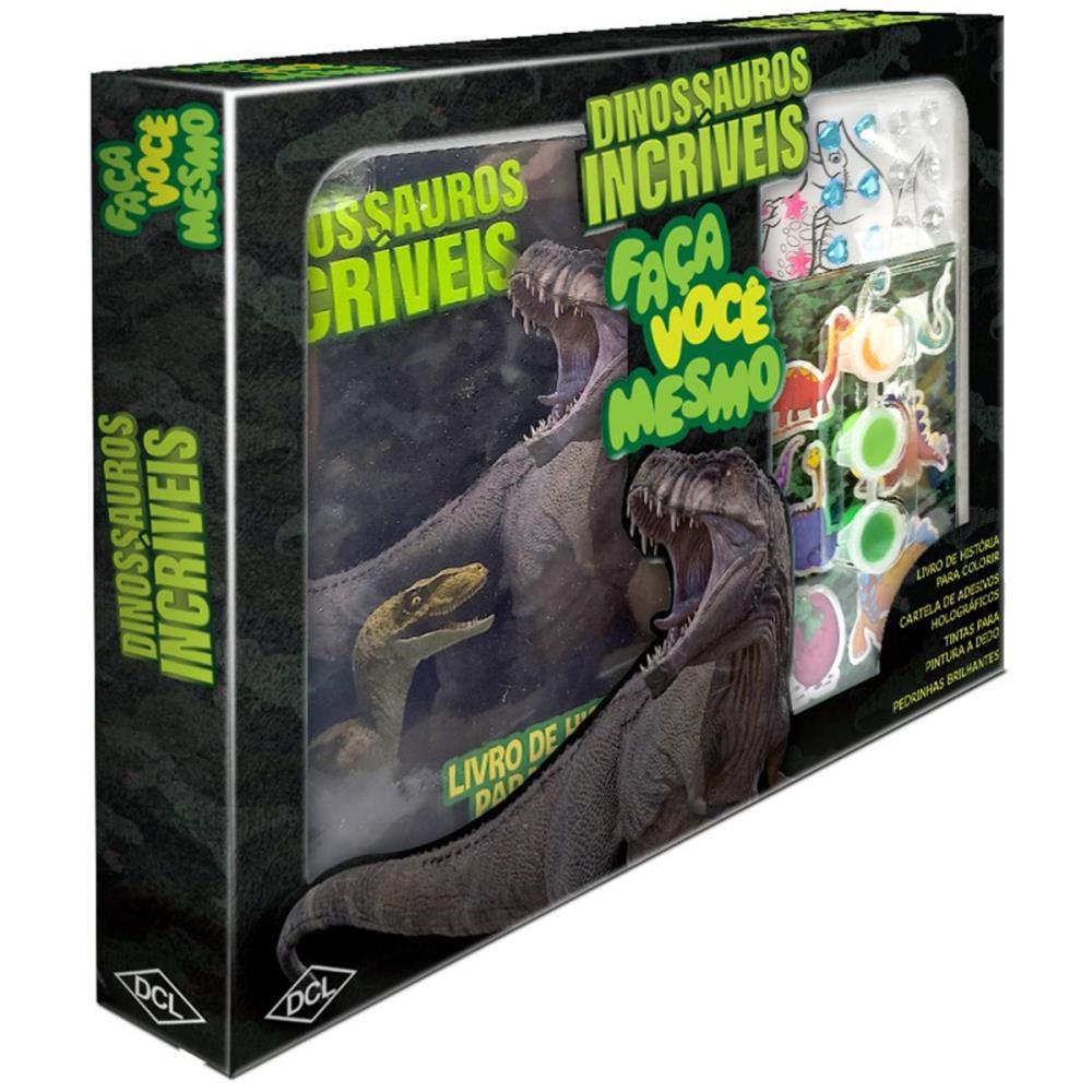 O kit Faça Você Mesmo traz um livro repleto de imagens para colorir de Dinossauros, tintas para pintura a dedo, adesivos e pedrinhas para decorar, excelentes para trabalhar o desenvolvimento motor, a criatividade e a concentração.