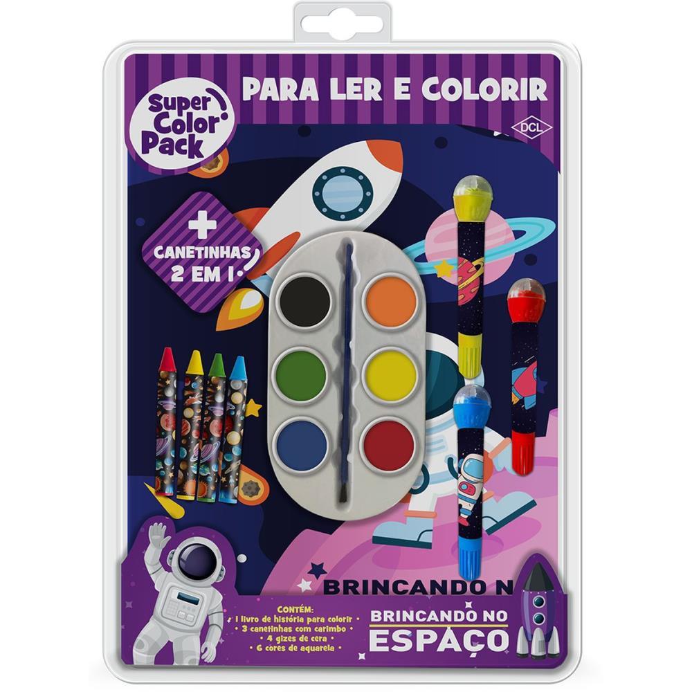 Livro cheio de diversão para brincar no espaço sideral. Este blister inclui livro para ler e colorir, gizes de cera, paleta de aquarela e canetinhas com carimbos acoplados. 8 Páginas.