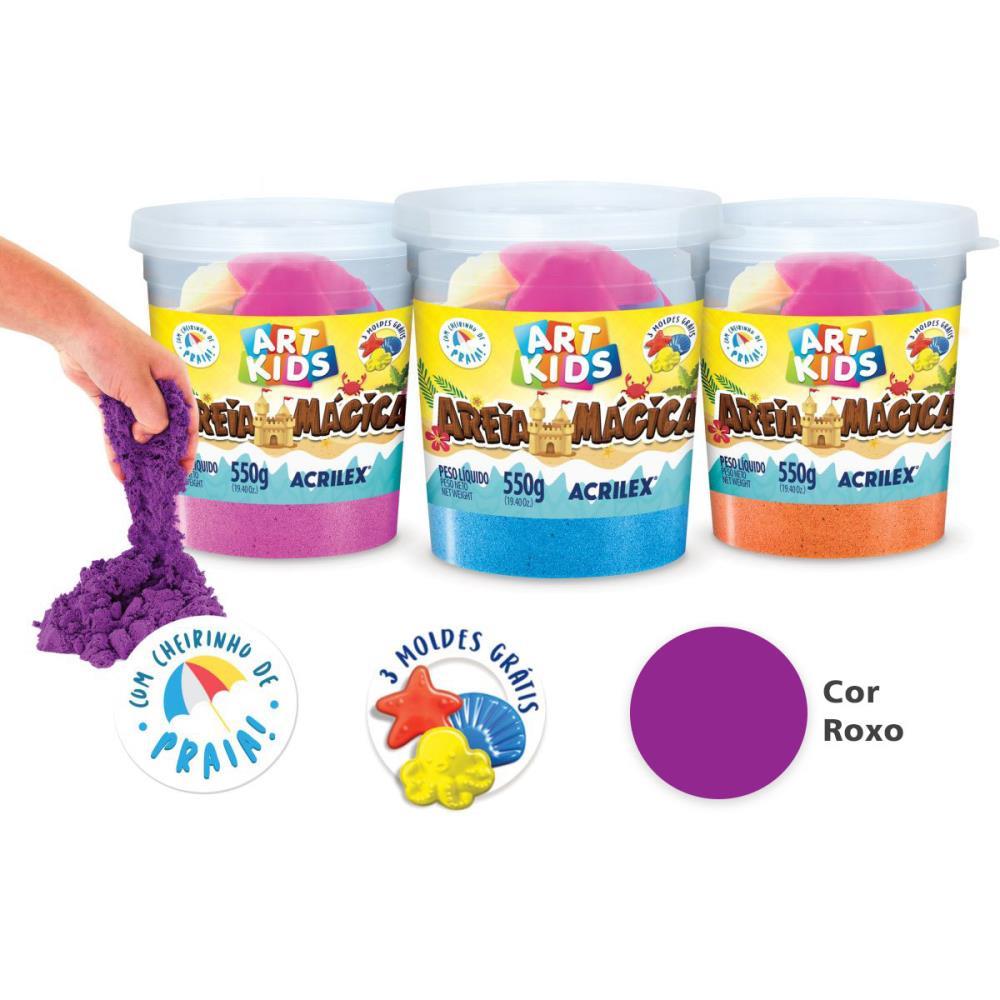 Areia Mágica 550g proporciona as crianças, uma incrível experiência sensorial, desenvolve a coordenação motora, habilidades manuais e a criatividade. Vem com 3 forminhas com tema praia para modelar. Cor: Roxo