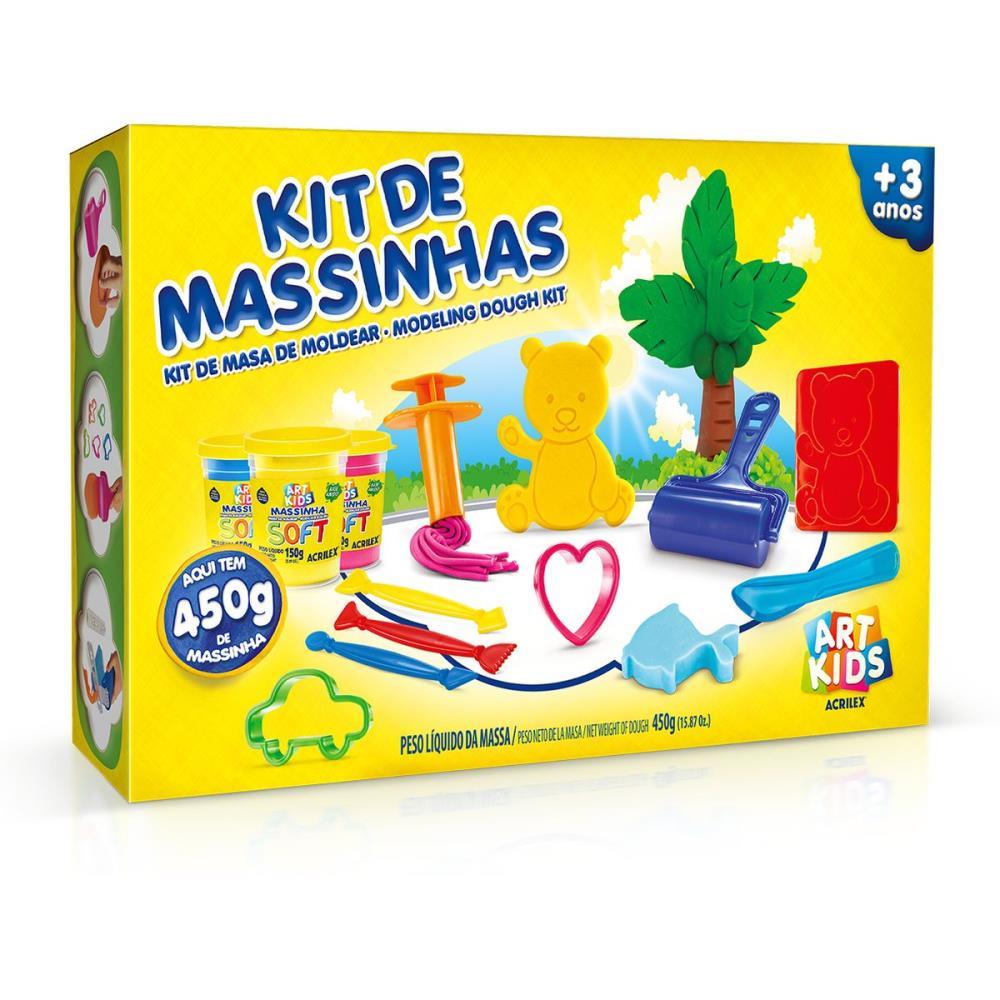 O kit contém: 3 potes de 150 g cada de massa, 8 moldes, 3 cortadores, 1 rolinho, 1 faquinha e 2 injetoras.