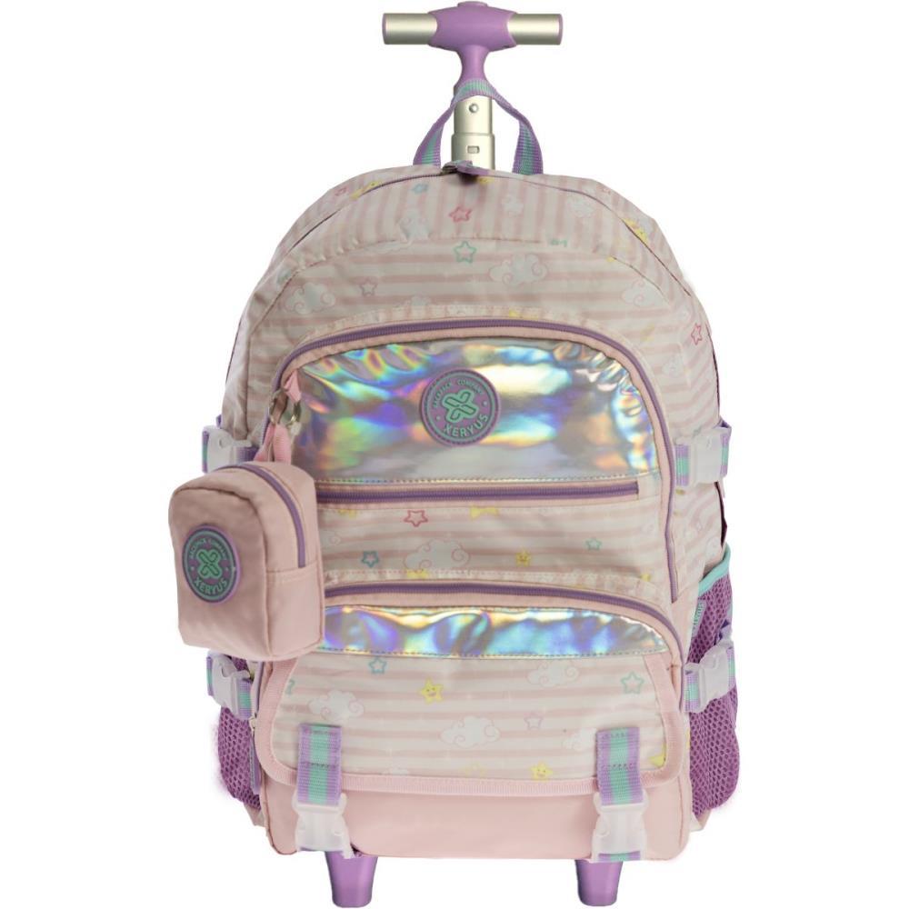 Mala com rodas 16 , produzida em poliester resistente estampado. Possui um compartimento principal amplo, 4 bolsos frontais, 2 bolsos laterais em mesh. Puxadores emborrachados personalizados. Carrinho com haste unica resistente. Acompanha chaveiro. Aplicacao de detalhes em PU metalizado holografico.