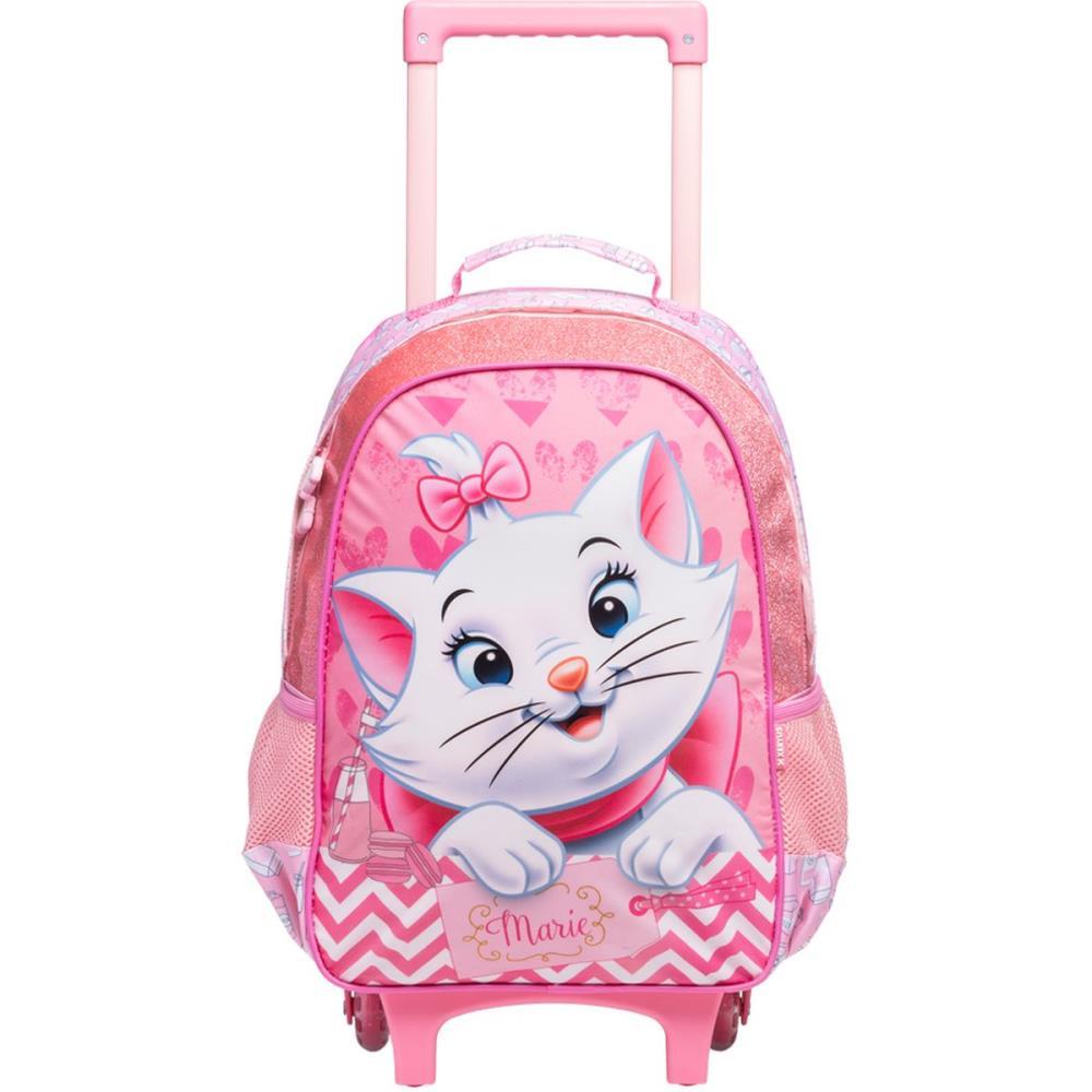 Mochila infantil com rodas tamanho G Marie..Altura de 40cm tamanho da mochila.Confeccionada em poliester de alta densidade; dois bolsos laterais em mesh para garrafas; hastes do carrinho em aco com regulagem de altura; rodas em material resistente e silencioso; ziper "trator" e puxadores persoanalizados em material emborrachado com icones da personagem. Possui cobre ziper para evitar a penetracao de agua Estampa no sistema de sublimacao e glitter no propio poliester. Produto Licenciado Original.