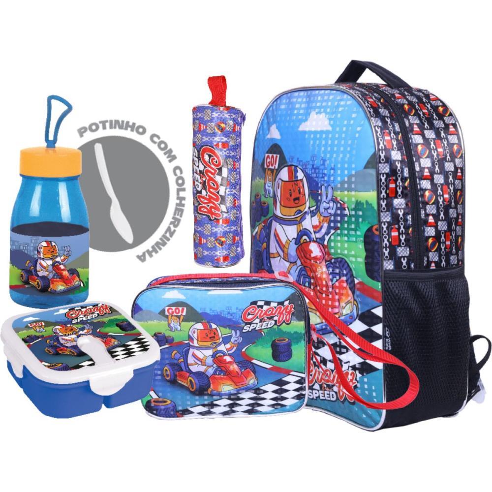 Atribuicoes: Mochila: 1 Divisao, 1 Bolso, 2 Bolsos Laterais | Lancheira: 1 Divisao, Termica | Estojo: 1 Divisao | Garrafa: