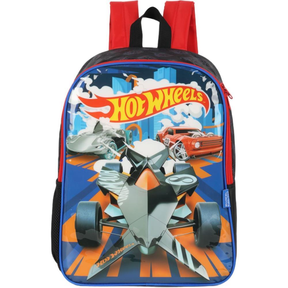 " Com a mochila “Hot Wheels” ir para a escola nunca foi tao divertido. A mochila possui um compartimento amplo e dois bolsos laterais de mesh com poliester para que voce possa levar seus objetos com toda a seguranca e autonomia necessaria, alem de um bolso frontal e detalhes em paete deixando ainda mais divertido levar os materiais. Com puxadores e chaveiro personalizados. A mochila possui estampas modernas e divertidas!