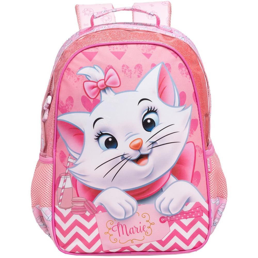 Mochila infantil tamanho G Marie..Altura de 40cm tamanho da mochila.Confeccionada em poliester de alta densidade; dois bolsos laterais em mesh para garrafas;; ziper "trator" e puxadores persoanalizados em material emborrachado com icones da personagem. Possui cobre ziper para evitar a penetracao de agua Estampa com sistema de sublimacao e glitter no propio poliester. Alcas de costas acolchoadas e forradas com material antitranspirante. Produto Licenciado Original.
